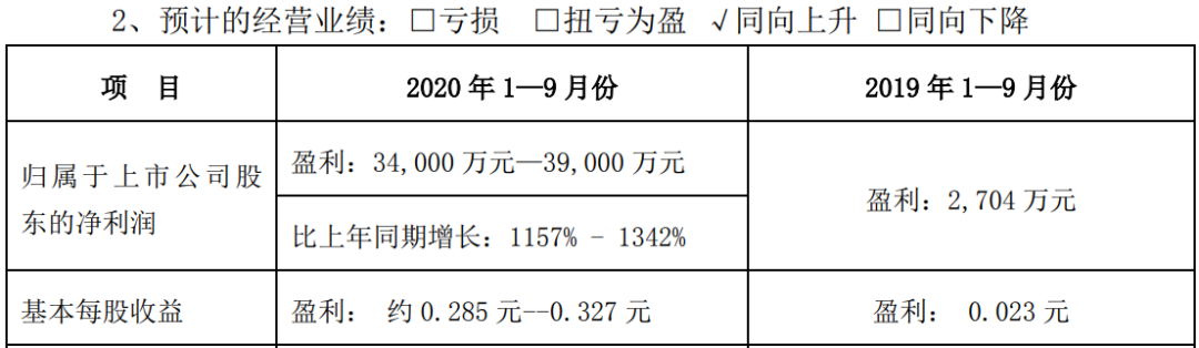 焦作万方预计,2020年前三季度实现归母净利润3.4亿元至3.9亿元,同比增长1157%至1342%。今年上半年,公司归母净利润同比增幅为540.68%。