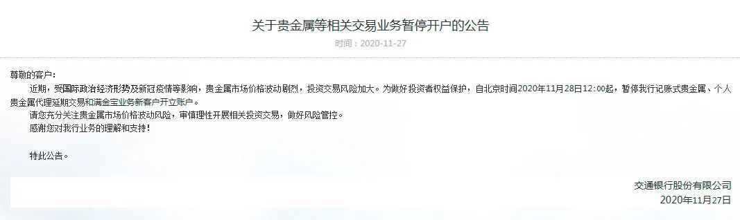 交通银行自11月28日12:00起,暂停记账式贵金属、个人贵金属代理延期交易和满金宝业务新客户开立账户。