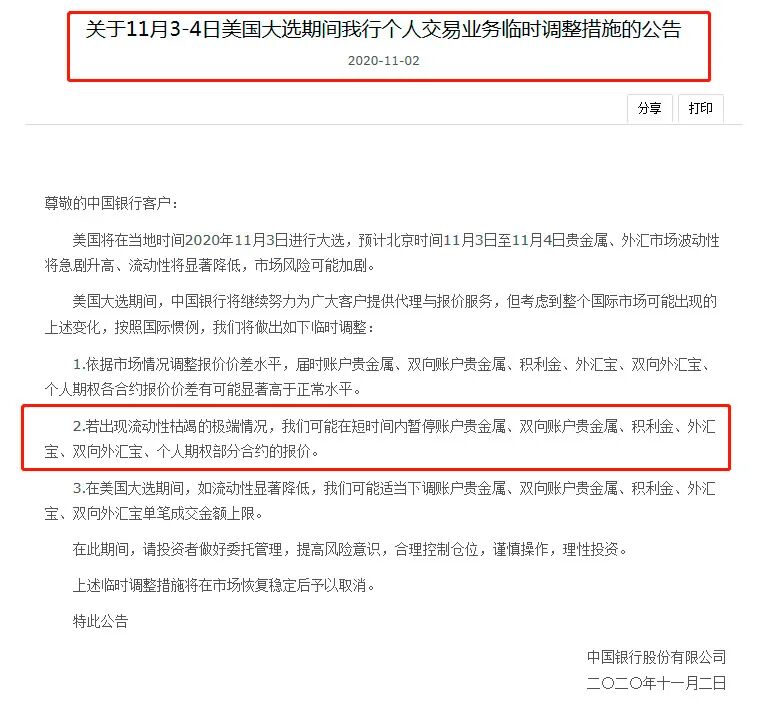 而考虑到美国大选期间,整个国际市场可能出现的波动变化,中国银行还于11月2日公告,对个人交易业务临时调整。其中一项为,若出现流动性枯竭的极端情况,该行可能在短时间内暂停账户贵金属、双向账户贵金属、积利金、外汇宝、双向外汇宝、个人期权部分合约的报价。
