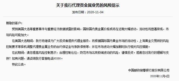 邮储银行于11月4日发布公告称,受到美国大选等重要事件与重要经济数据披露的影响,国际国内贵金属价格或将在近期大幅波动,流动性将显著降低,市场风险可能加大。