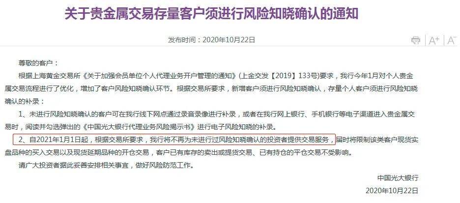 此外,早在10月22日,光大银行就对贵金属交易存量客户发出风险提示,自2021年1月1日起,根据交易所要求,该行将不再为未进行过风险知晓确认的投资者提供交易服务。