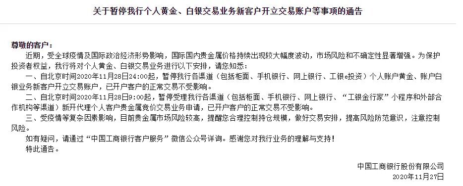 工商银行自11月28日24:00起,暂停各渠道(包括柜面、手机银行、网上银行、工银e投资)个人账户黄金、账户白银业务新客户开立交易账户;11月28日9:00起,暂停受理我行各渠道新开代理个人客户贵金属竞价交易业务申请。