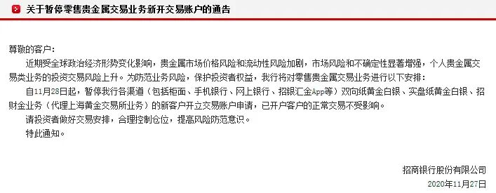 招商银行自11月28日起,暂停该行各渠道双向纸黄金白银、实盘纸黄金白银、招财金业务(代理上海黄金交易所业务)的新客户开立交易账户申请。