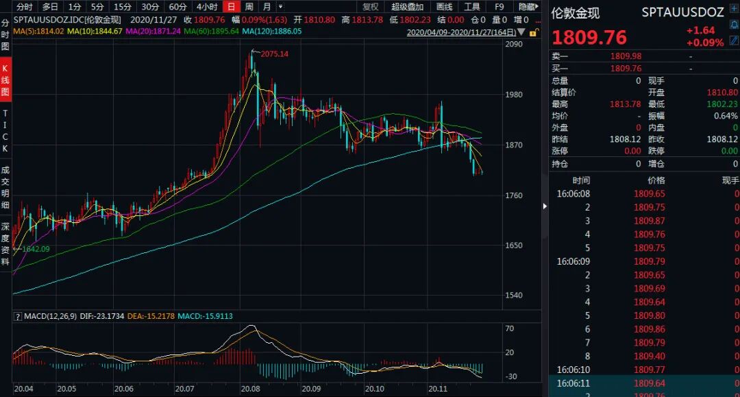 11月初以来,黄金巨幅下挫,接连下破重要关口。当前,现货黄金距离历史高点已大幅下滑,围绕1800美元/盎司展开拉锯。截至今日发稿,国际现货黄金日内涨0.05%,报1809.10美元/盎司。