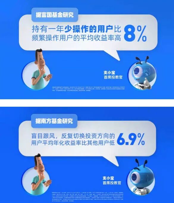 如据富国基金研究,持有一年操作少的用户比频繁操作的用户平均收益率高8%;据南方基金研究,盲目跟风,反复切换投资方向的用户平均年化收益率比其他用户低6.9%;据天弘基金研究,持有基金3年及以上,是短期持有基金1年的平均收益率的4倍……