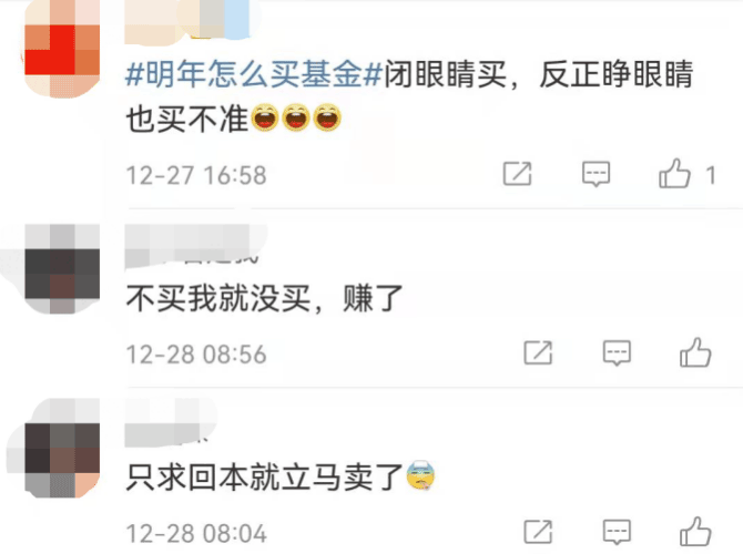 谈及“明年怎么买基金”,有基民表示只求回本就卖,就没想明年买基的事儿;甚至有基民直言,明年闭眼睛买,反正睁眼睛也买不准。
