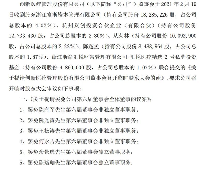 但短暂的“蜜月期”过后,并购标的之一建华医院与创新医疗渐生罅隙,爆发了激烈的内斗,双方各执一词针锋相对。当年牵线并购的“红娘”浙商创投也开始“倒戈”。在2019年审议罢免时任董事、监事议案的股东大会上,昌健投资、岚创投资投出了赞成票,导致创新医疗实控人之一陈海军在内的董事会成员被罢免。