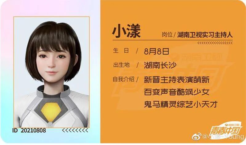 这其中虚拟人“小漾”格外引人注目。据湖南卫视官方介绍,小漾的名字来自于英文的“young”,代表着青春与活力,也是湖南卫视“青春中国”创新升级的重要尝试。事实上,这并非“小漾”首次与大众见面。2021年10月2日,小漾就开通了个人微博,定位为“湖南卫视实习主持人”。