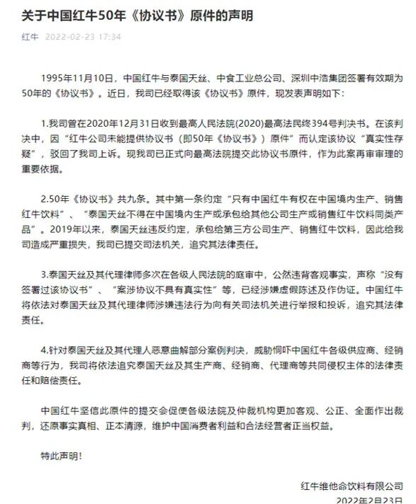 在最新的声明中,中国红牛宣称,中国红牛股东方50年协议应是本案审理的关键。根据1995年11月10日签署的50年《协议书》约定,中国红牛享有在中国境内独家生产、销售红牛饮料的权利,有效期限为50年(自1995年11月10日至2045年11月9日)。同时,在50年协议基础上,设立中国红牛时,合资合同中约定泰国天丝向中国红牛提供商标、红牛维生素功能饮料产品上的商标是合资公司资产的一部分。围绕中国红牛的这两项核心权利,深圳前海法院以及深圳国际仲裁院相关案件均已开庭,不日即将判决或裁定。