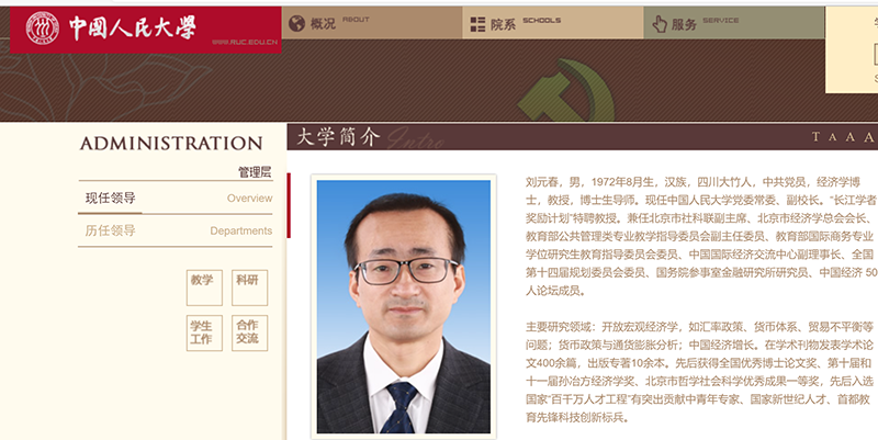 刘元春简介(中国人民大学官网截图)
