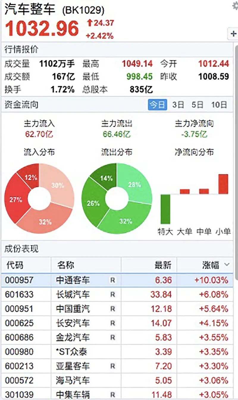受到汽车下乡政策有望出台消息的刺激,A股、港股汽车板块今日再度联袂上涨。A股中通客车“四连板”,港股蔚来涨近7%。