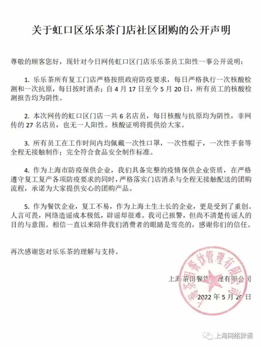 5月20日,针对上述传言,虹口区乐乐茶门店发布一则声明称,所有复工门店严格按照政府防疫要求,每日严格执行一次核酸检测和一次抗原,每日按时消杀;自4月17日至今5月20日,所有员工的核酸检测报告均为阴性。本次网传的虹口区门店一共6名店员,每日核酸与抗原均为阴性。门店附上了所有员工的核酸证明截图。声明中还提到,作为上海市防疫保供企业,乐乐茶具备完整的疫情保供企业资质,在严格遵守复工复产各项防疫要求的同时严格落实门店消杀与全程无接触配送的团购流程,承诺为大家提供安心的团购产品。