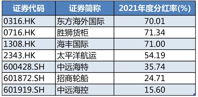 记者对港股航运公司的统计数据显示,东方海外国际、胜狮货柜、海丰国际的2021年度分红率均超过70%,太平洋航运的分红率达54%,其中东方海外国际是中远海控的间接控股子公司。
