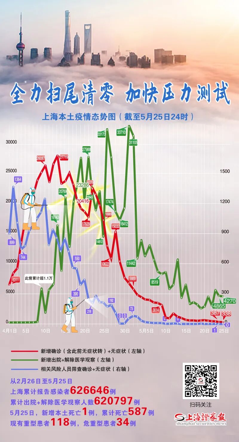 2月26日0时至5月25日24时,上海累计本土确诊57867例,治愈出院55387例,在院治疗1893例(其中重型118例,危重型34例)。累计死亡587例。
