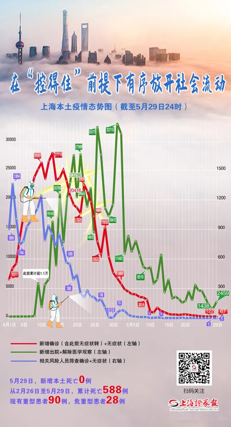 2月26日至5月29日,上海累计本土确诊57986例,治愈出院55909例,在院治疗1489例(其中重型90例,危重型28例),死亡588。现有待排查的疑似病例0例。