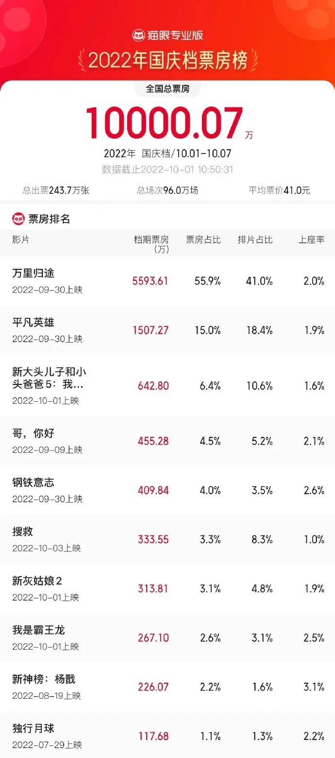 2022年国庆档拉开帷幕,猫眼专业版数据显示,截至10月1日10时50分,2022年国庆档(10月1日-10月7日)总票房破亿元。同时,截至记者发稿,2022年国庆档新片票房榜即将突破2亿元。