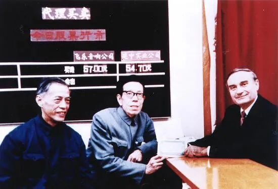1986年11月16日,纽约证券交易所主席约翰•凡尔霖手持飞乐音响公司股票到中国工商银行上海市信托投资公司静安证券业务部办理过户手续。左一为该业务部经理黄贵显,左二为时任中国人民银行上海分行行长的李祥瑞