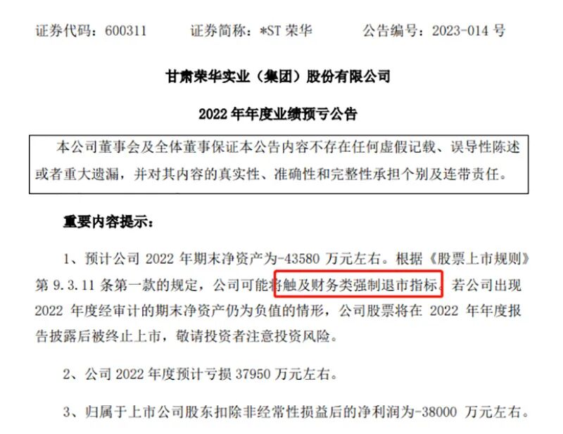 *ST荣华预计2022年归母净资产为-43580万元左右,也触发“净资产为负”退市指标。2022年年报披露后,若经审计数与业绩预告数相符,将触发退市指标,两家公司将被终止上市。