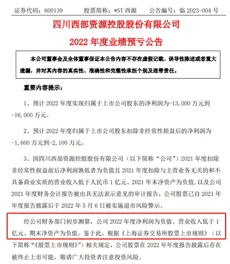 伴随2022年业绩预告发布,两公司则基本锁定财务类强制退市。*ST西源预计2022年度扣非净利润为-1600万元到-2100万元,实现营业收入为8万元到10万元,扣除与主营业务无关的业务收入和不具备商业实质的收入后的营业收入为0万元到1万元,归母净资产为-6亿元到-7亿元,触发“营业收入低于1亿元+扣非净利润为负”“净资产为负”等多重退市风险。