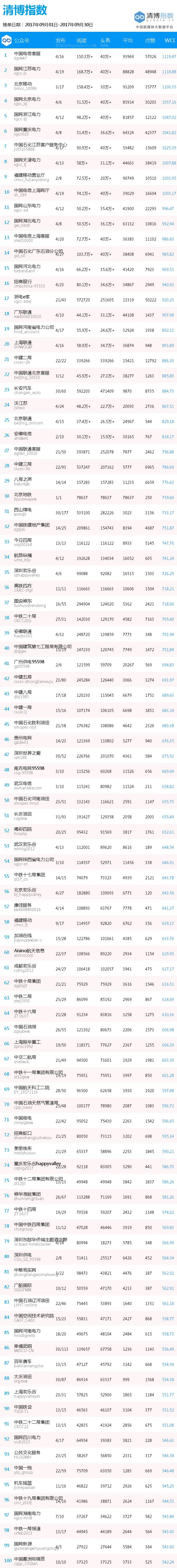 国资委新闻中心(@国资小新)联合清华大学新闻研究中心、清博大数据、中国青年报、中国经济网正式推出“中央企业二级账号新媒体指数榜”,收集、分析了2017年9月1日至9月30日期间400多个中央企业二级新媒体账号的基础数据,对企业微信运营的实际绩效和影响力进行专业性考量。