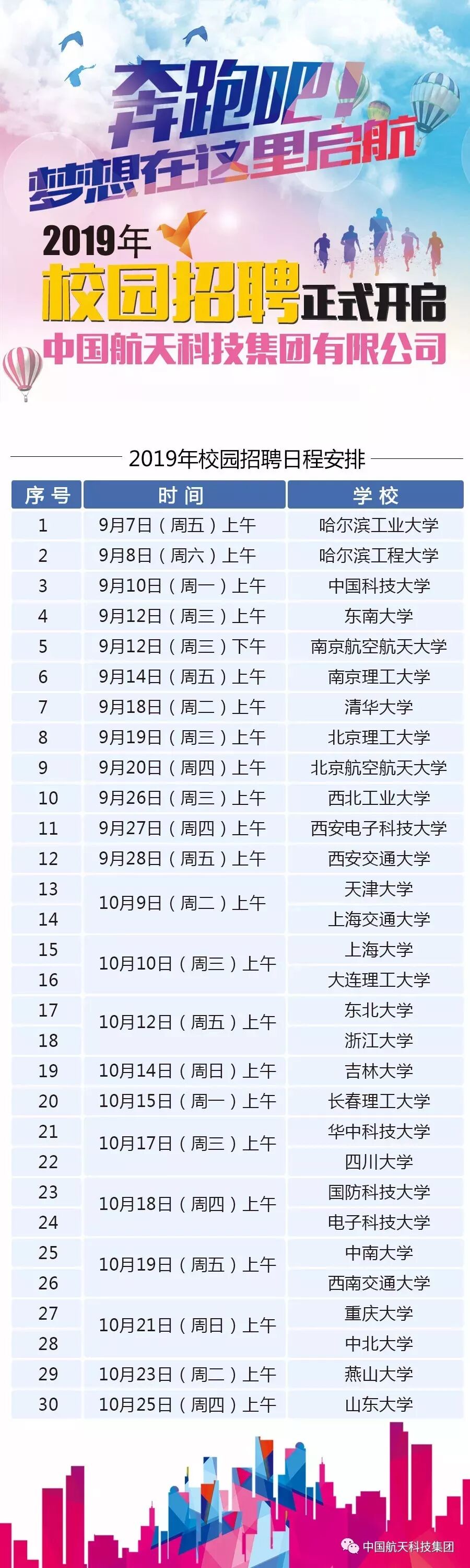 中国航天科技集团有限公司2019年高校毕业生校园招聘,采取串行、并行相结合,学校招聘大会、院系招聘小会相结合的形式在全国30所高校开展,具体安排如下: