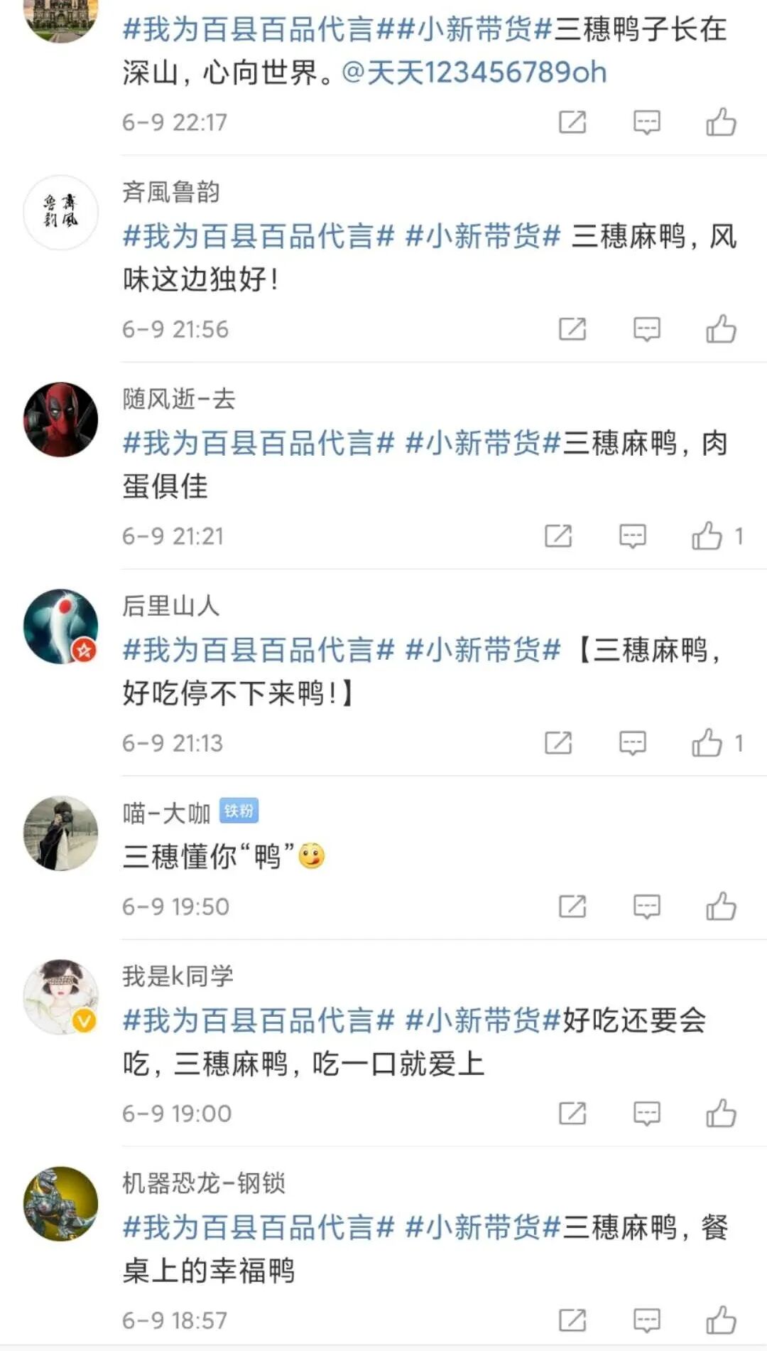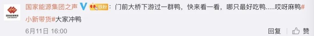 中核集团、兵器工业集团、中国石油、中国石化、国家能源集团、中国电信、中国煤炭地质总局、中广核、中国生物等众多企业转发互动,为三穗麻鸭带货助力。
