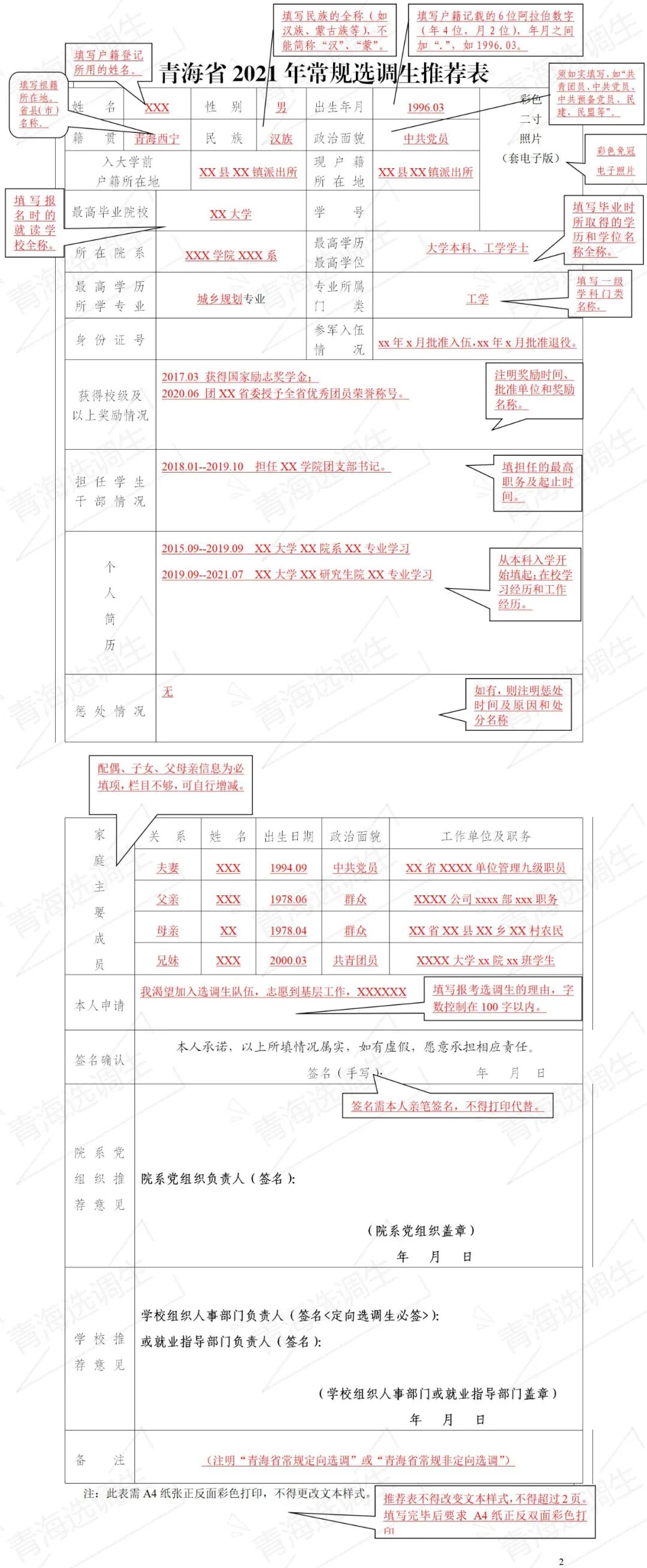 为进一步加强青海省干部队伍源头建设,大力发现储备优秀年轻干部,根据《公务员法》等有关规定,2021年继续选调优秀大学毕业生到基层工作。现将有关事宜公告如下:计划选调350名,按照公务员考录程序统一招录,全部安排到全省县乡基层工作。(一)常规定向选调。从省内高校定向选调180名,其中,青海大学、青海师范大学、青海民族大学各60名。安排到海西、海南、海北、玉树、果洛、黄南六个州乡镇工作(四类以上高海拔地区约占80%)。不限专业。(二)常规非定向选调。从省内外二本及以上高校选调170名,安排到全省县乡基层工作(四类以上高海拔地区约占60%)。其中,不限专业50名,限专业门类120名(涉及法学、文学、经济学、工学、理学、管理学、医学、哲学、农学9个专业门类)。根据干部队伍建设需要,在上述有专业门类要求的职位中,有针对性地重点选调我省基层紧缺的经济学类、金融学类、财政学类、计算机类、旅游管理类(参考《普通高等学校本科专业目录(2020年版)》)以及城建规划类、会计与审计类、环境科学类、农林业工程类专业(参考《青海省公务员招录专业设置分类参考目录》)的应届优秀大学毕业生。部分法院系统基层职位中有法学(需取得国家法律职业资格C证及以上)和文学门类要求的职位,须进行藏汉双语测试。定向(可到青海工作的除外)、委托、在职培养的高校毕业生,自考、函授、电大等成人教育毕业生不列入选调范围。报考人员除了应当符合《公务员法》《公务员录用规定》的报考资格条件,同时还应符合以下条件:(一)有正确的政治立场和政治态度,认真学习习近平新时代中国特色社会主义思想,增强“四个意识”,坚定“四个自信”,做到“两个维护”,在思想上政治上行动上同以习近平同志为核心的党中央保持高度一致。(二)具有中华人民共和国国籍和户籍,且无国(境)外永久居留权。(三)自觉践行社会主义核心价值观,爱党爱国,有远大的理想抱负和真挚的家国情怀,服从组织安排,志愿到基层和艰苦偏远地区工作,甘于为新青海建设服务奉献。(四)学习成绩优良,作风朴实,诚实守信,吃苦耐劳,有较好的人际沟通和语言文字表达能力。具有国内第二批本科及以上高校2021届全日制大学本科及以上学历并获得相应学位,考生学历证书与学位证书的取得时间截止2021年7月31日,如在此期限内仍未按期取得学历证书与学位证书,取消其选调资格。(五)身心健康,具备在青海县乡基层一线正常履职的身体条件和心理素质。(六)必须具备下列条件之一(以下条件需在报名前取得,并提供相关证明材料):2.学生干部:在选调高校就读期间,担任团委或团支部书记、副书记或团属组织学生干部;担任院系及以上学生会、学社联等学生组织学生干部;担任班干部,以及由学校团委管理的社团社长、副社长。学生干部经历须满1年以上。3.获得校级及以上奖励(团体奖励除外):在选调高校就读期间,获得优秀学生、三好学生、优秀学生干部、优秀团干部、优秀团员等校级及以上荣誉称号;获得国家奖学金、校级专项奖学金等校级及以上奖学金。同等条件下,优先考虑推荐有参军入伍经历和同时具备两项以上条件的人员报名。相关证明材料须提供原件或由所在高校有关部门核实后盖章确认的复印件。(七)截止报名结束前,年满18周岁以上,大学本科毕业生一般为1996年3月1日以后出生,硕士研究生一般为1991年3月1日以后出生,博士研究生一般为1986年3月1日以后出生(以公安机关印发的第二代居民身份证日期为准)。具有参军入伍经历的,年龄要求可相应放宽2年。(九)凡有以下情形之一的,不得报名:1.在校期间有违法违纪违规行为、学术不端或道德品行有问题的人员;2.因犯罪受过刑事处罚的人员;3.被开除中国共产党党籍的人员;4.被开除公职的人员;5.被依法列为失信联合惩戒对象的人员;6.在公务员招考中违规违纪在禁考期内的人员;7.公务员(参公人员)被辞退未满5年的人员;8.受过处分的人员;9.具有法律规定不得录用为公务员的其他情形人员。选调工作采取本人自愿报名、党组织审核推荐、组织人事部门考试与考察相结合的办法进行,具体安排如下:1.省内高校定向选调生推荐。由省内高校党委按分配名额1:1.5比例,坚持品学兼优,突出对人选政治素质的要求,从符合选调条件的应届大学毕业生中严格遴选、好中选优、从严把关。按照学院党组织初审、组织部门资格复审、征求相关部门意见、学校党委会研究等程序进行,推荐名单须在学校官网或就业信息网公示无异议后,于3月10日(星期三)前以学校党委名义,由党委组织部负责将《青海省2021年常规选调生推荐人选名册》(见附件1)报中共青海省委组织部。2.省内外高校非定向选调生推荐。报考人员本人申请,经所在院系党组织严格初审、高校党委组织部门(学生处、就业指导中心)审核汇总,并报高校党委研究同意,确定推荐名单。推荐名单须在校内公示无异议后,于3月12日(星期五)前向中共青海省委组织部提供《青海省2021年常规选调生推荐人选名册》(见附件1,可直接提供盖章后的PDF文档电子版并发送至qhsxds@126.com)。1.网上报名。凡经学校党组织推荐,且符合条件的高校应届毕业生于2021年3月8日(星期一)9:00起登录报名网站(www.qhpta.com)进入报名系统,按照提示进行注册,认真仔细阅读诚信承诺书,并按要求如实、准确、逐项