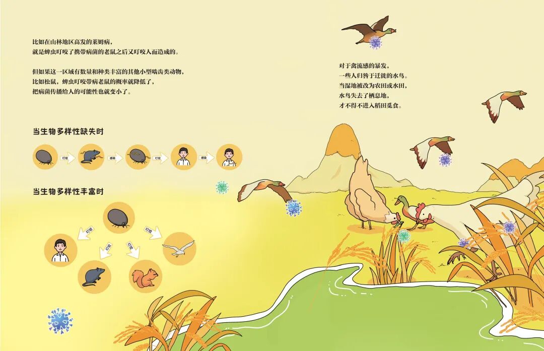 例如,插画师设计了一幅象和犀牛拿着盾牌的画面,比喻动物们守卫着生态平衡,而健康的生态系统也能够更好地抵御自然灾害: