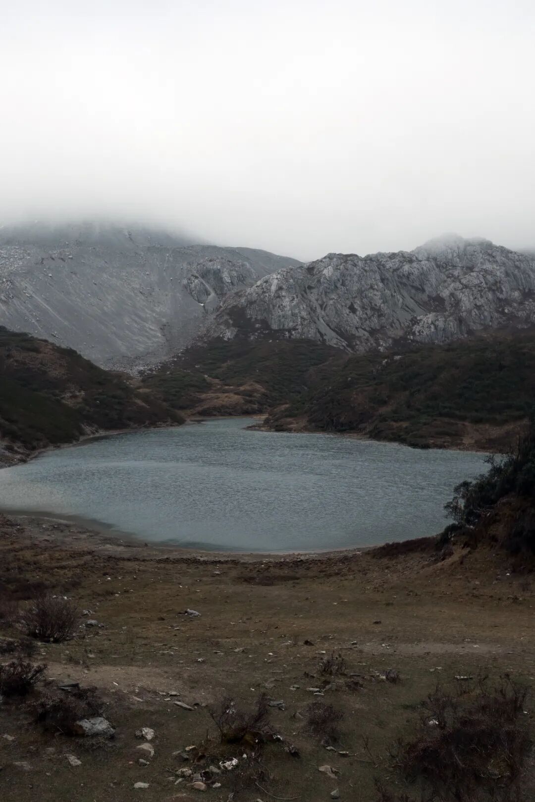 当我们下到湖边时,风越来越大,云雾也越来越浓密,空中渐渐飘起了小雨,整个阿布吉措被笼罩在雾中。向导笑着和我们说,虽然阴雨天登山对我们来说未必是好事,但他们感谢我们为当地求来了雨水。