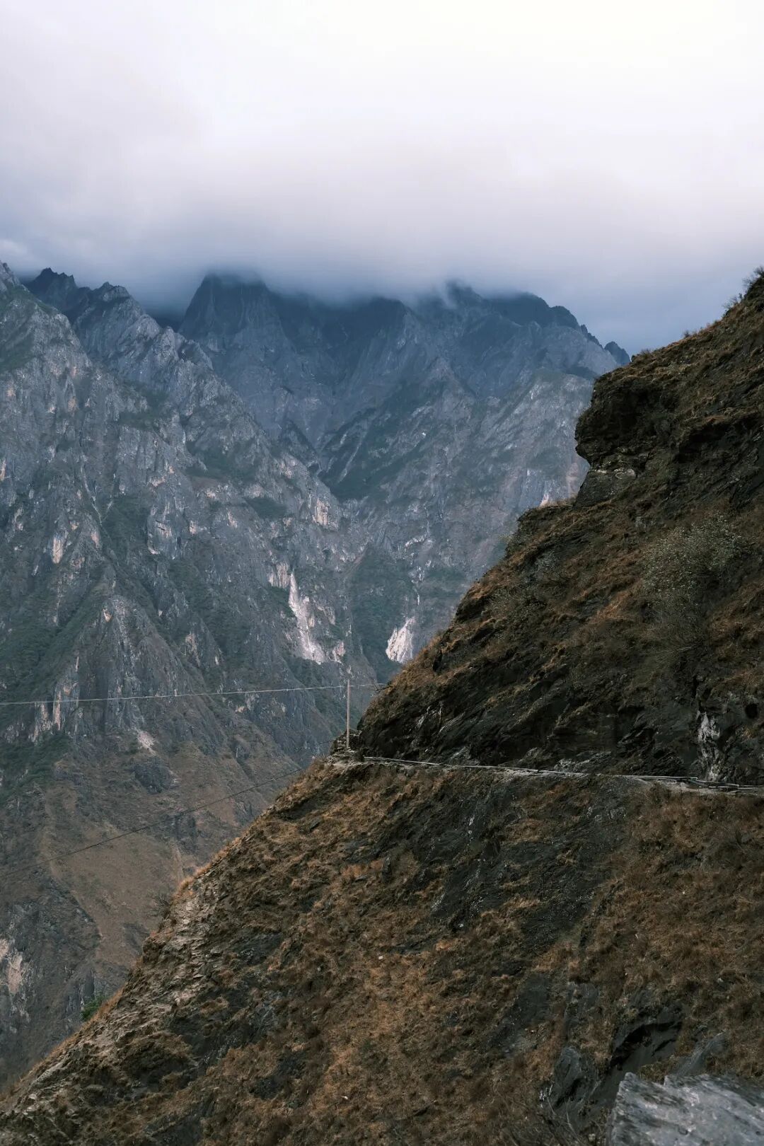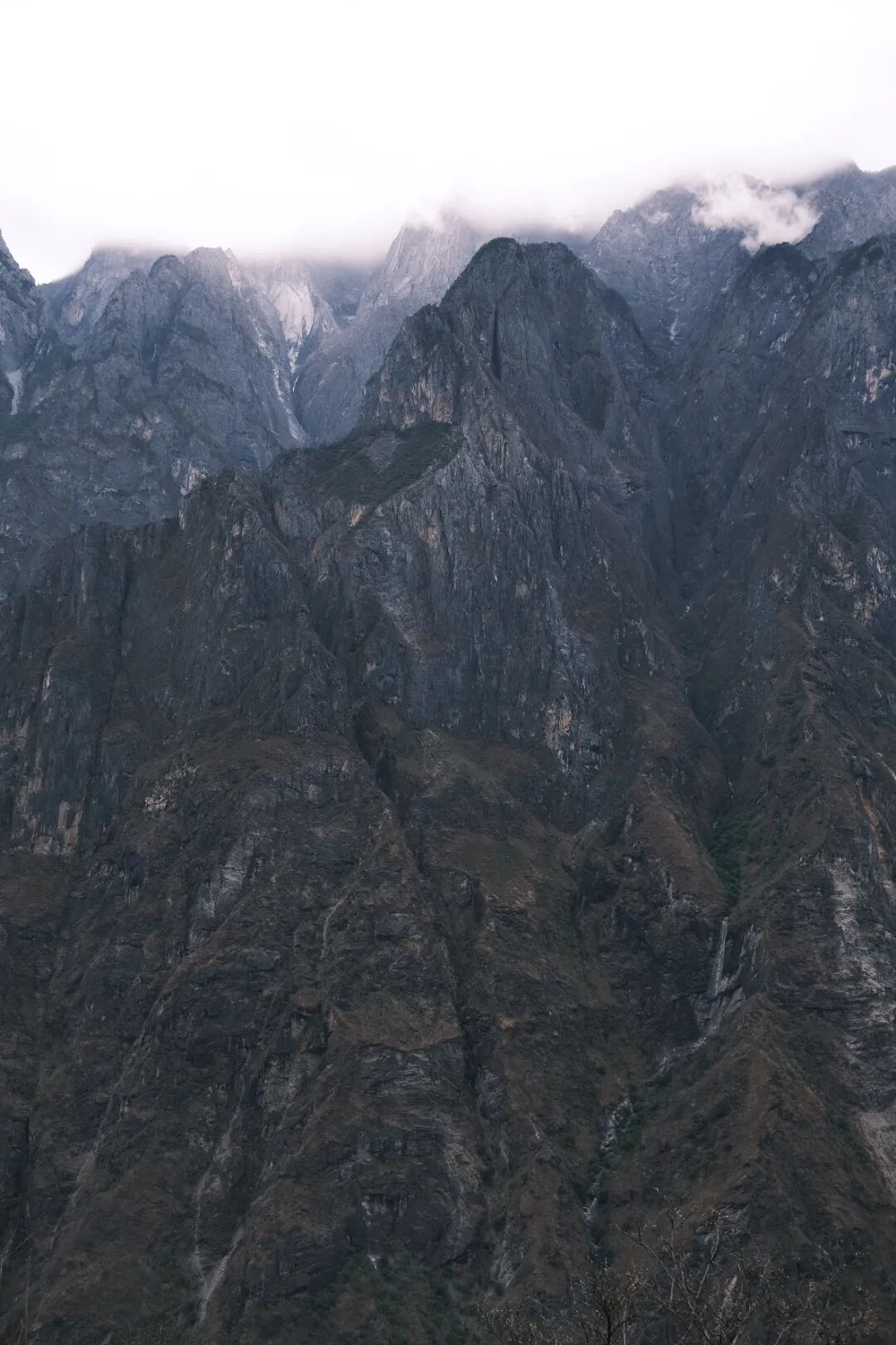 南岸的玉龙雪山,海拔近5600米,临峡的一段非常陡峭,怪石嶙峋,几乎无路可走,山体呈焦枯的灰褐色,草木稀少。从对岸望过去,重岩叠嶂,山顶云雾缭绕,就在你眼前飘荡,真的有“手可摘星辰”的感觉了。