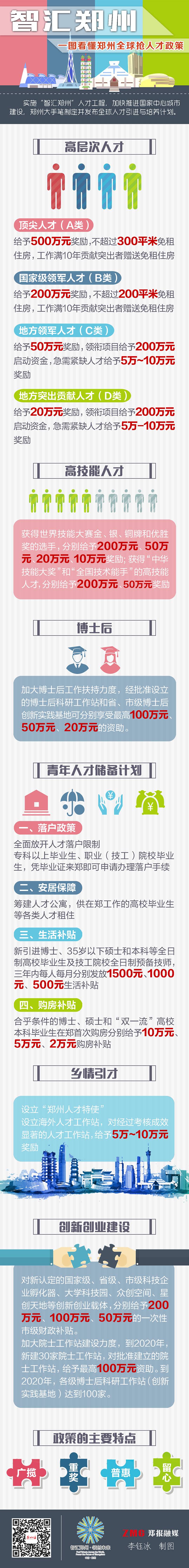 根据计划,通过实施“智汇郑州”人才工程,到2020年,我市将引进培育5—10个顶尖创新创业团队,聚集100名国内外顶尖人才、3000名重点产业急需紧缺人才、2000名社会事业领域领军和专业骨干人才,新增40000名高技能人才,每年吸引20万名高校毕业生在郑创新创业。