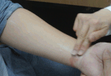 2)再用食指和中指的指面沿着孩子左手前臂尺侧(小手指掌侧位),自肘关节推向腕纹尺侧,连推49下或81下。注意次数与刚才推右手臂的次数最好一样。古人管这叫“退六腑”。