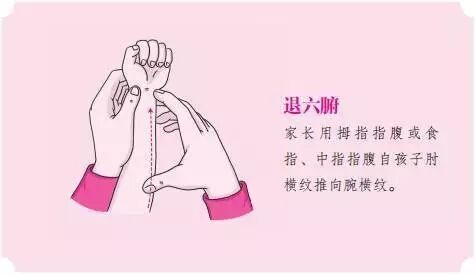 1)左手握住孩子的右手腕偏上一点点的地方,右手食指和中指的指腹沿着孩子的右前臂内侧正中——自腕横纹推至肘横纹,连推49下或81下。古人管这叫“清天河水”,这个简单的方法能很快退烧。
