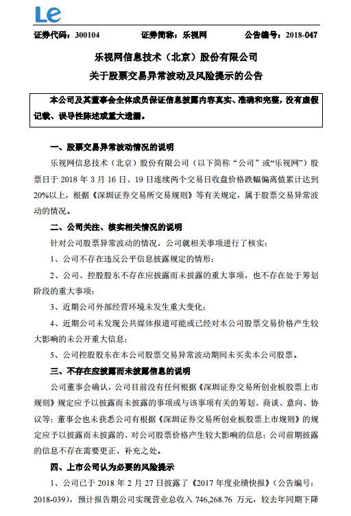 乐视网也在公告中再次提请投资者注意实控人可能发生变更、部分关联方应收款项存在回收风险、贾跃亭及贾跃芳未履行借款承诺导致公司现金流紧张等八大投资风险。