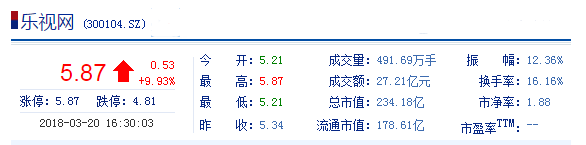 3月20日,乐视网连续跌停被打开,股价低开2.48%之后震荡拉升,午后更是放量冲击涨停。在最后一小时的交易时段内,乐视网股价始终维持在涨停板附近高位震荡,临近收盘成功封死涨停。截至20日收盘,乐视网股价报5.87元,全天成交27.21亿元,换手率16.16%,涨停价位封单量2.94万手。