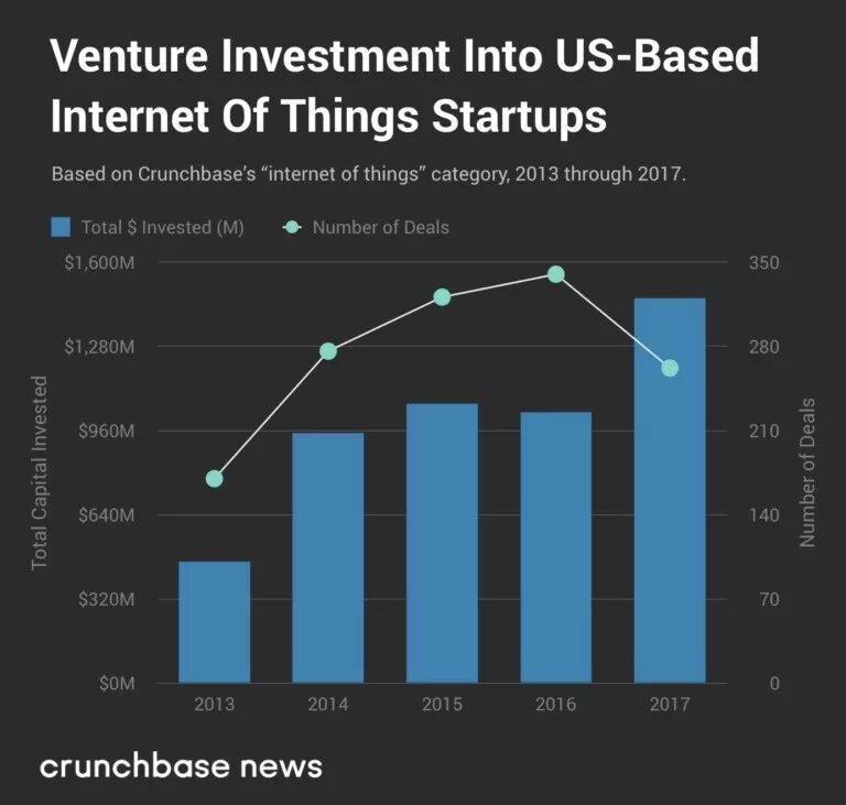 根据Crunchbase的数据,2017年,仅美国的物联网创业公司获得的风险投资金额就达到了年度最高纪录。投资者向初创公司投入了14.6亿美元,比2016年的10.3亿美元增长42%,比2013年的4.617亿美元增长216%。
