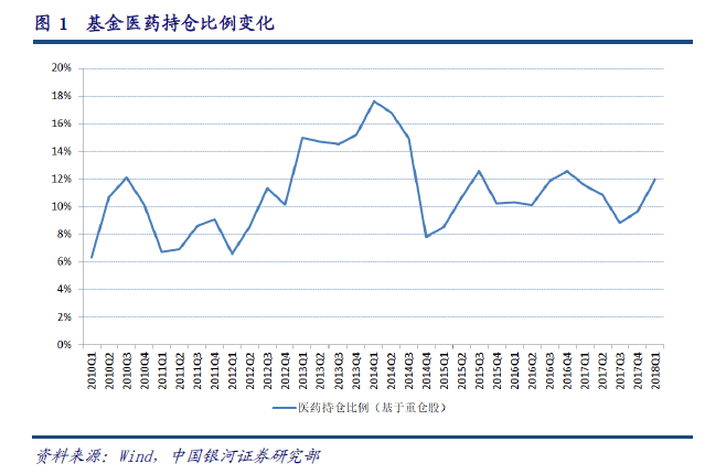 这种直观的感受反映到持仓上,便是基金对医药行业持仓量逐步提升。银河证券数据显示,2018年一季度,所有主动非债基金十大重仓股中,医药股的持仓比例(剔除港股)较2017四季度上升了2.32%至11.99%,增幅排名行业第一。