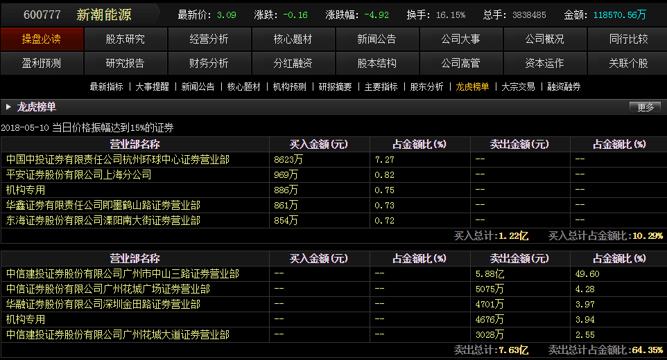 具体来看,新潮能源“卖出”前三名分别为中信建投广州中山三路营业部(5.88亿元)、中信证券广州花城广场营业部(5075万元)和华融证券深圳金田路营业部(4701万元)。