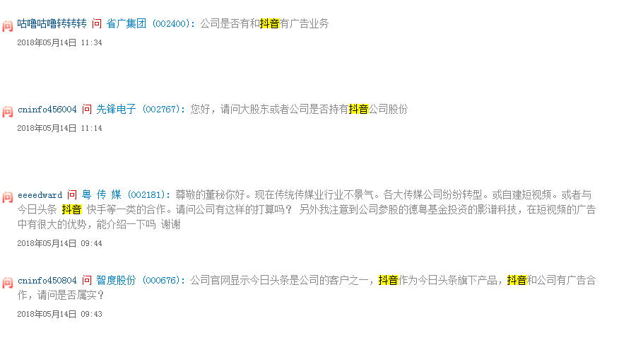从互动平台上看,投资者的热情并未受到影响。5月14日,大家继续向关注的公司发问,确认其是否与抖音存在合作;最好是干脆直接持股抖音;实在不行,将公司的产品放在抖音上宣传宣传也行。