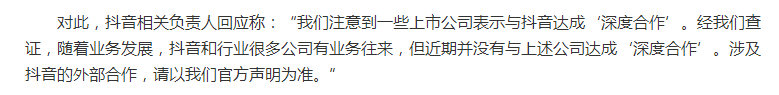 在此火爆行情下,抖音通过公开报道否认了所谓的“深度合作”,并提出:“请以我们官方声明为准”。