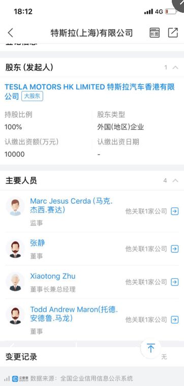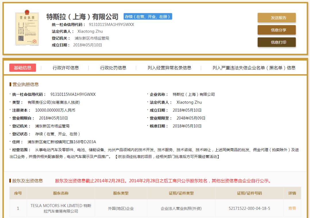 根据工商登记显示,特斯拉(上海)有限公司在2018年5月10日正式成立,住所显示浦东新区南汇新城镇同汇路168号D203A,法定代表人为Xiaotong Zhu(特斯拉中国区总裁朱晓彤)。