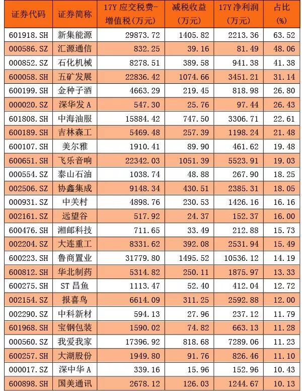 如果把减税收益与2017年净利润进行比较,可以看到,占比超过10%的公司有26家(见下表),超过20%的公司有8家,新集能源以63.52%的增收幅度居首。