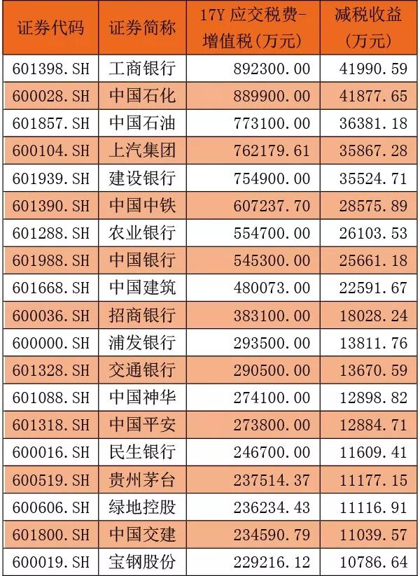 另外,由于这部分减税收益是企业税前所得,考虑到目前上市公司企业所得税实际税率在20%左右,因此再乘以0.8便可以估算出此次增值税减税能够为相关企业带来的增量收益水平,即减税收益=(应交税费—增值税)/17×0.8。