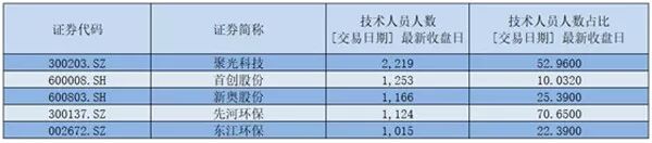 榜单显示,上海洗霸、先河环保、易世达、神雾环保、聚光科技技术人员占总员工的比例均在50%以上。