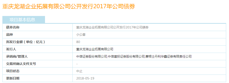 5月19日,上交所公司债券项目信息平台显示,重庆龙湖企业拓展有限公司拟公开发行的80亿元2017年公司债券已经中止。