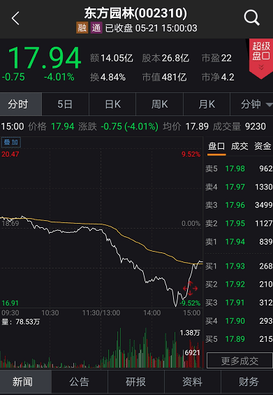 发行结果一经公告,引发市场关注。午后,东方园林股价大跌,下午一度接近跌停,最终收于17.94,下跌4.01%。