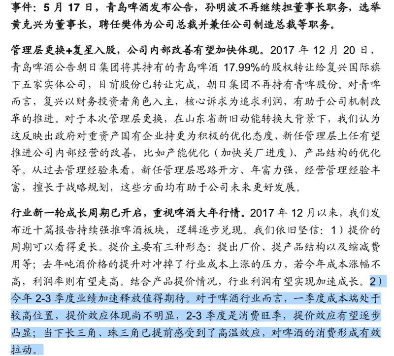 除开夏天和世界杯因素,中泰证券研究报告认为,青岛啤酒还存在“管理层更换+复星入股 ”、“行业新一轮成长周期已开启,重视啤酒大年行情”两大基本面利好因素。