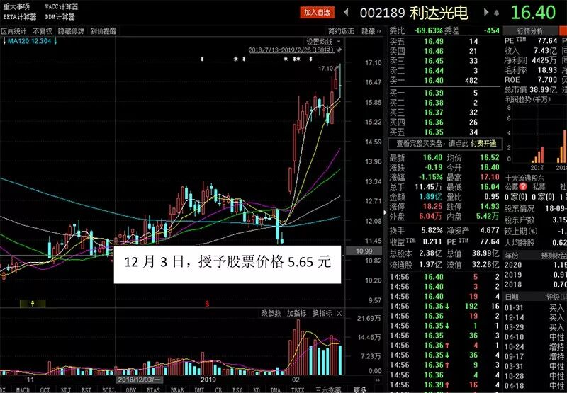 据查询,2018年12月3日,利达光电发布激励预案,拟向包括公司董事长在内的高管授予196.3万股限制性股票,授予价格为5.65元每股,公司最新股价16.4元,浮盈约190%。2月14日,公司已经向103名激励对象授予了176.7万股。