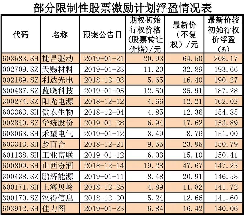据上证报资讯不完全统计,2018年12月份以来推出的限制性股票激励计划中,目前账面浮盈超过150%的公司还有傲农生物、阳光电源、梦百合、蓝晓科技、工业富联、天赐材料、华统股份等。