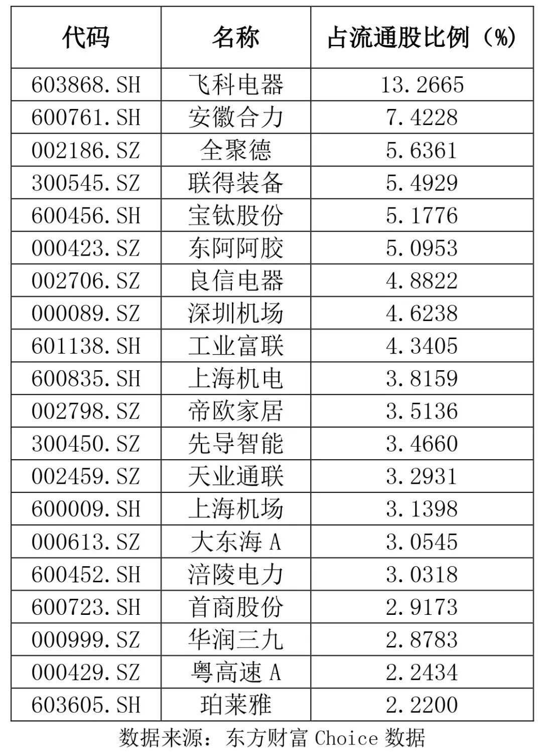 从占流通股持股比例来看,共有6家公司的QFII持股比例超过5%。其中飞科电器持股比例达13.27%,占比最高,其次是安徽合力达7.42%。全聚德、联得装备、宝钛股份和东阿阿胶的持股比例在5%左右。